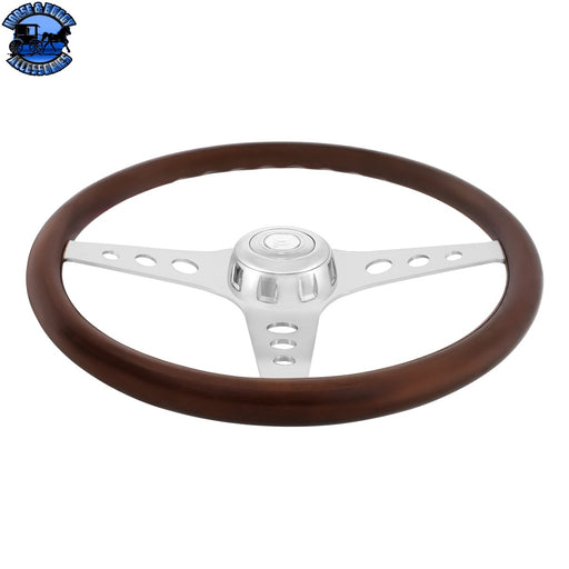 Polished wood rim with chrome horn bezel and horn button. 3 spoke "blade" steering wheel. 18" diameter with comfortable finger grips on back edge ...