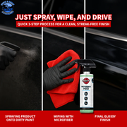 Spray Renegade NOtorious H2O Waterless Wash onto a microfiber towel and directly onto the contaminated surface. Be sure to start from the top and make your way down, to avoid run-off and additional work.